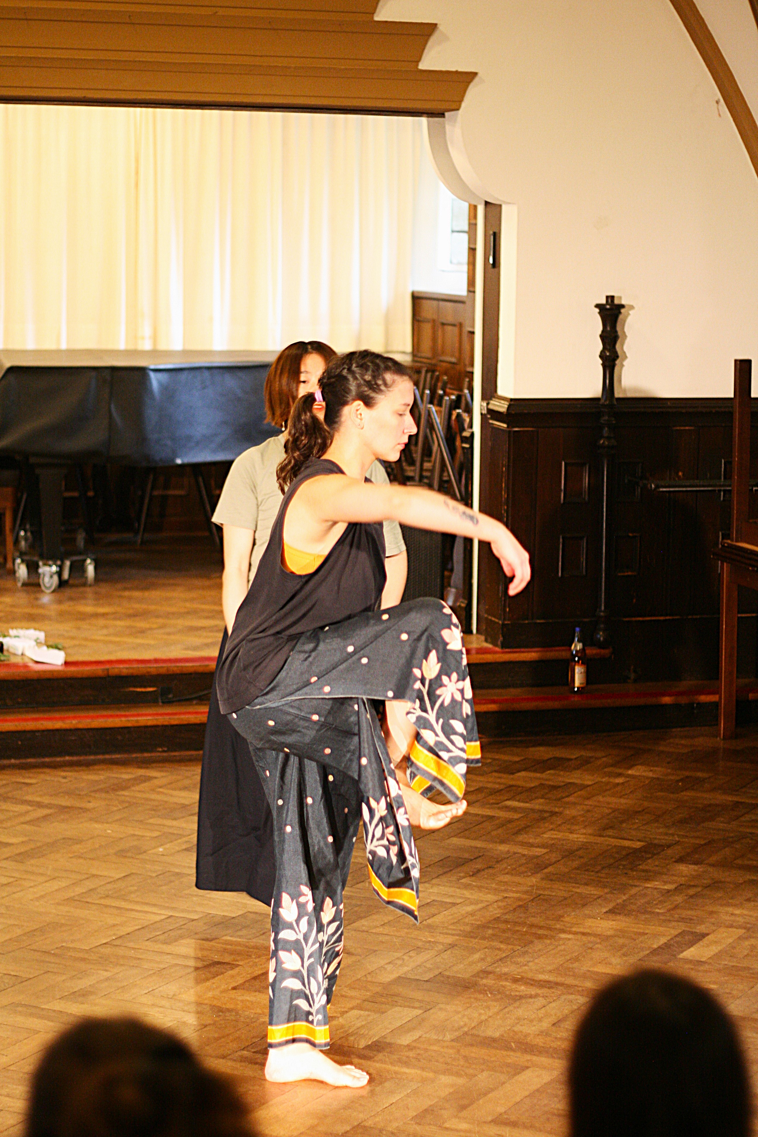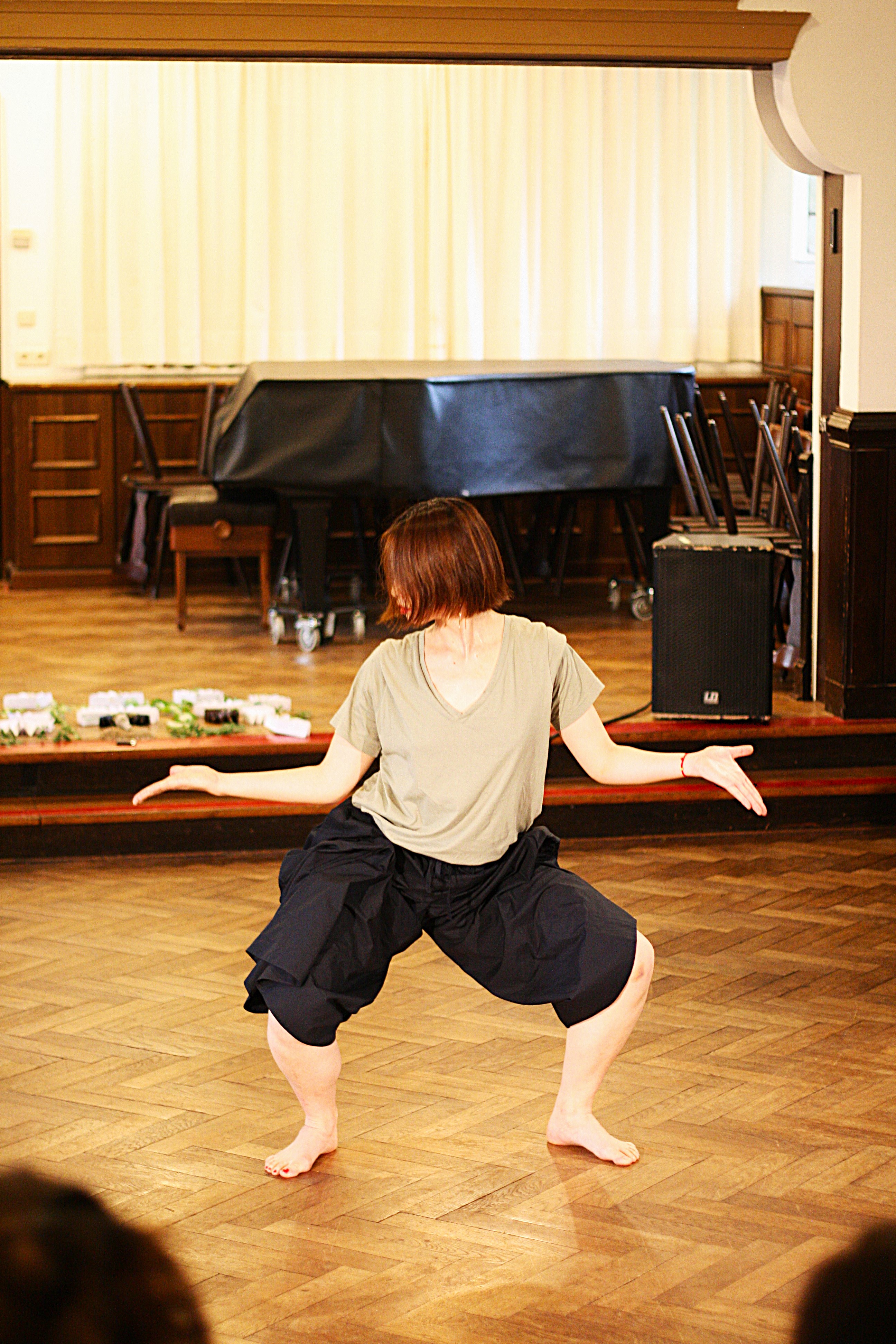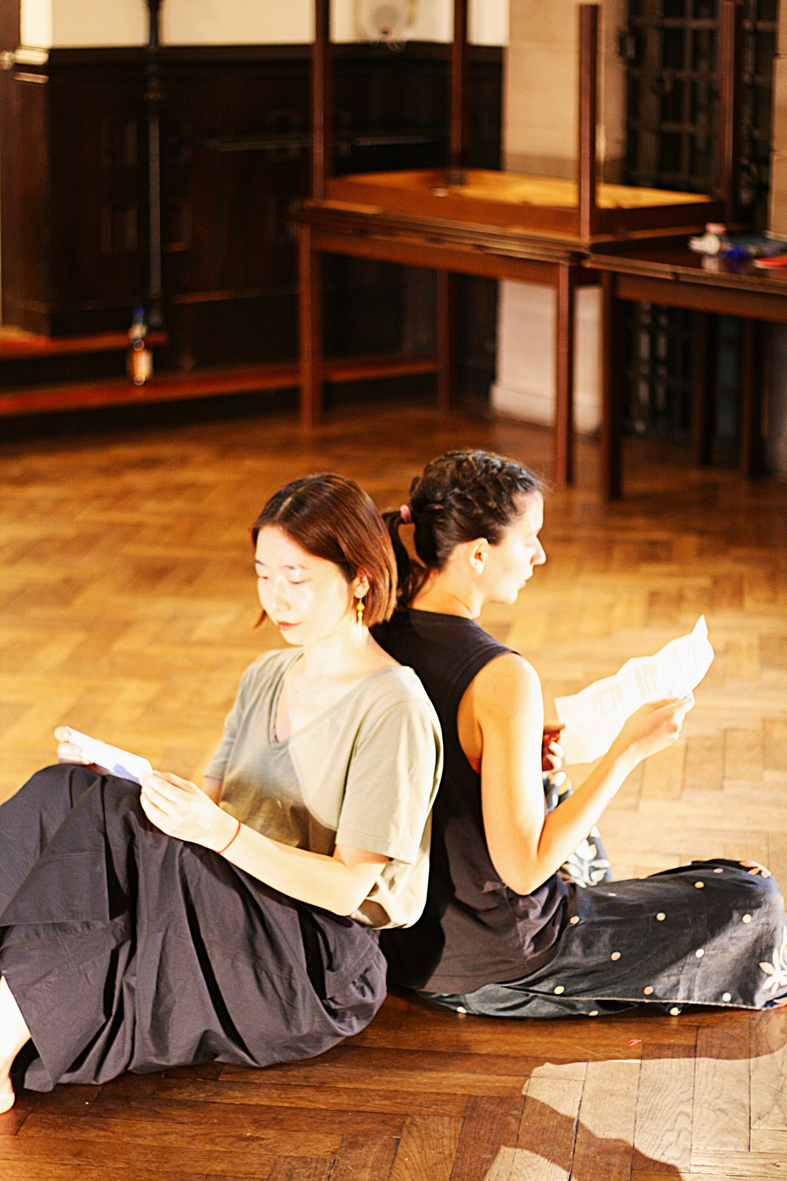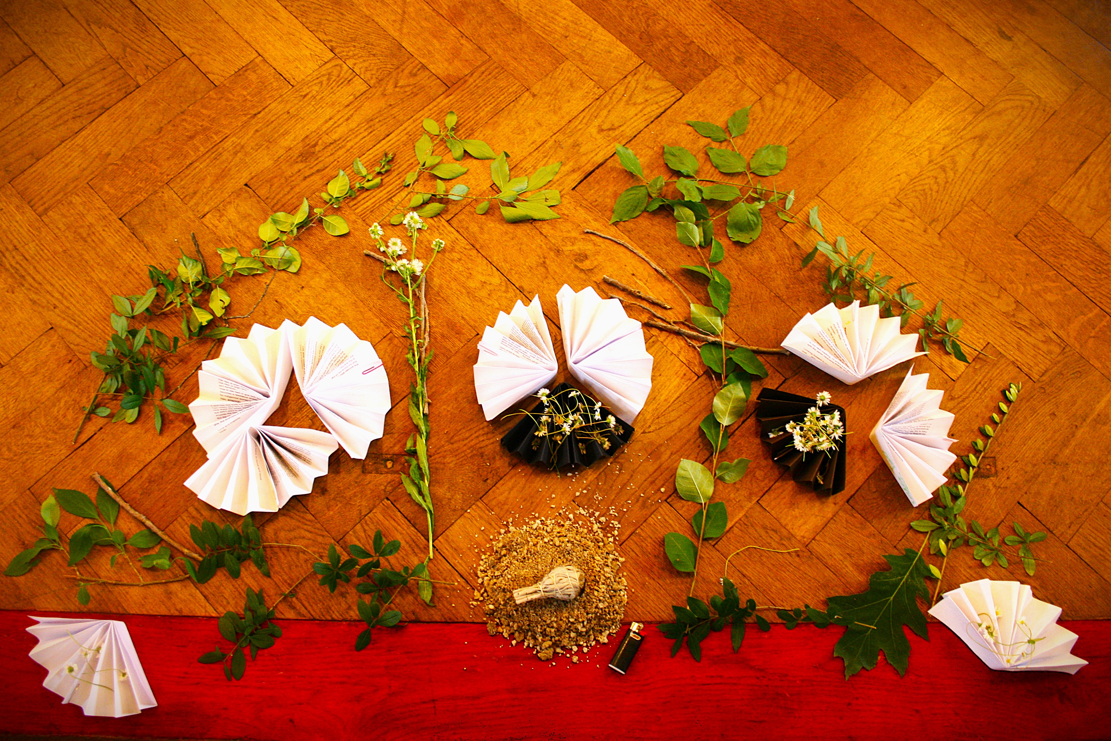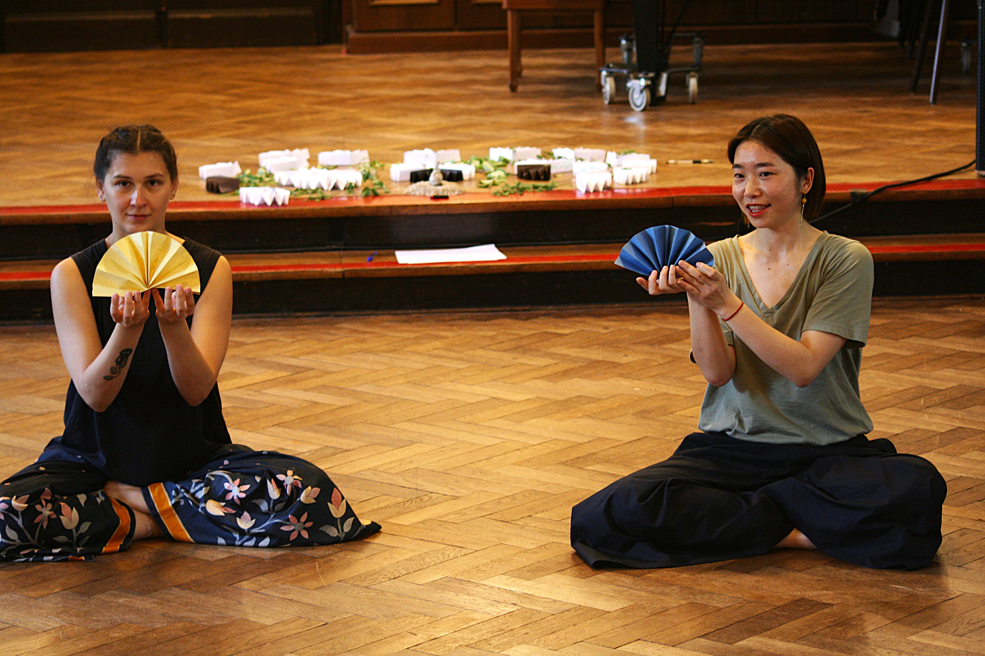 The audience is invited to sit in a half circle, while the performers offer practices of cleasning with herbds and breathing consciously, followed by a reading of multiple stories/letters combined with dance improvisation. Towards the end, we bring out attention back to the audience, as we guide them into fan origami making and writing wishes to each other, following the traditions of Nüshu.